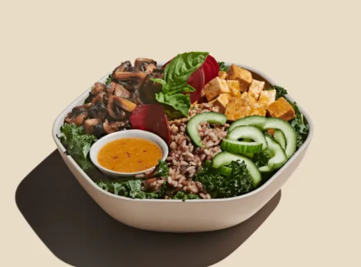 Shredded kale, warm wild rice, basil, cucumber, raw beet, spicy sunflower seeds, roasted sesame tofu, warm portobello mix, miso sesame ginger dressing